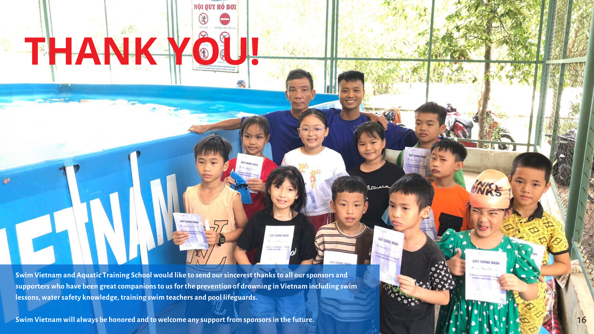 Looking ahead, we are excited to share our plans for the coming year. Our goals include expanding our reach to more underserved communities, increasing the number of certified swimming instructors, and enhancing our water safety programs. We believe that with your continued partnership, we can save even more lives and create a future where drowning is no longer a major risk for children in Vietnam.